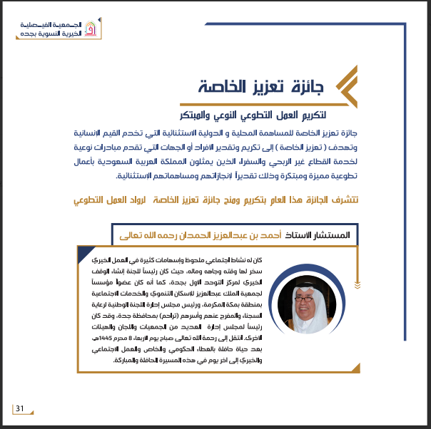 تعتبر جائزة تعزيز لتمكين العمل التطوعي مبادرة من مبادرات الجمعية الفيصلية والتي تجسد رؤية المملكة 2030 للوصول إلى مليون متطوع، ومن منطلق المعيار الوطني إدامة انبثق شعار تعزيز تعبيراً عن توجه الجائزة والتي تقدم لتنمية وبناء قدرات المتطوعين والفرق التطوعية من خلال تعزيز العمل التطوعي وتشجيع أفراد المجتمع على التطوع و تقديرالمتطوعين ورواد العمل الاجتماعي ودعم نواحي التمّيزوالابتكار.